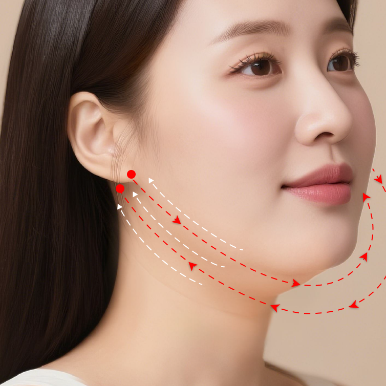 실을 두 번 교차 고정해 늘어진 턱선을 단단히 당겨주며, 또렷하고 매끄러운 윤곽을 완성합니다.